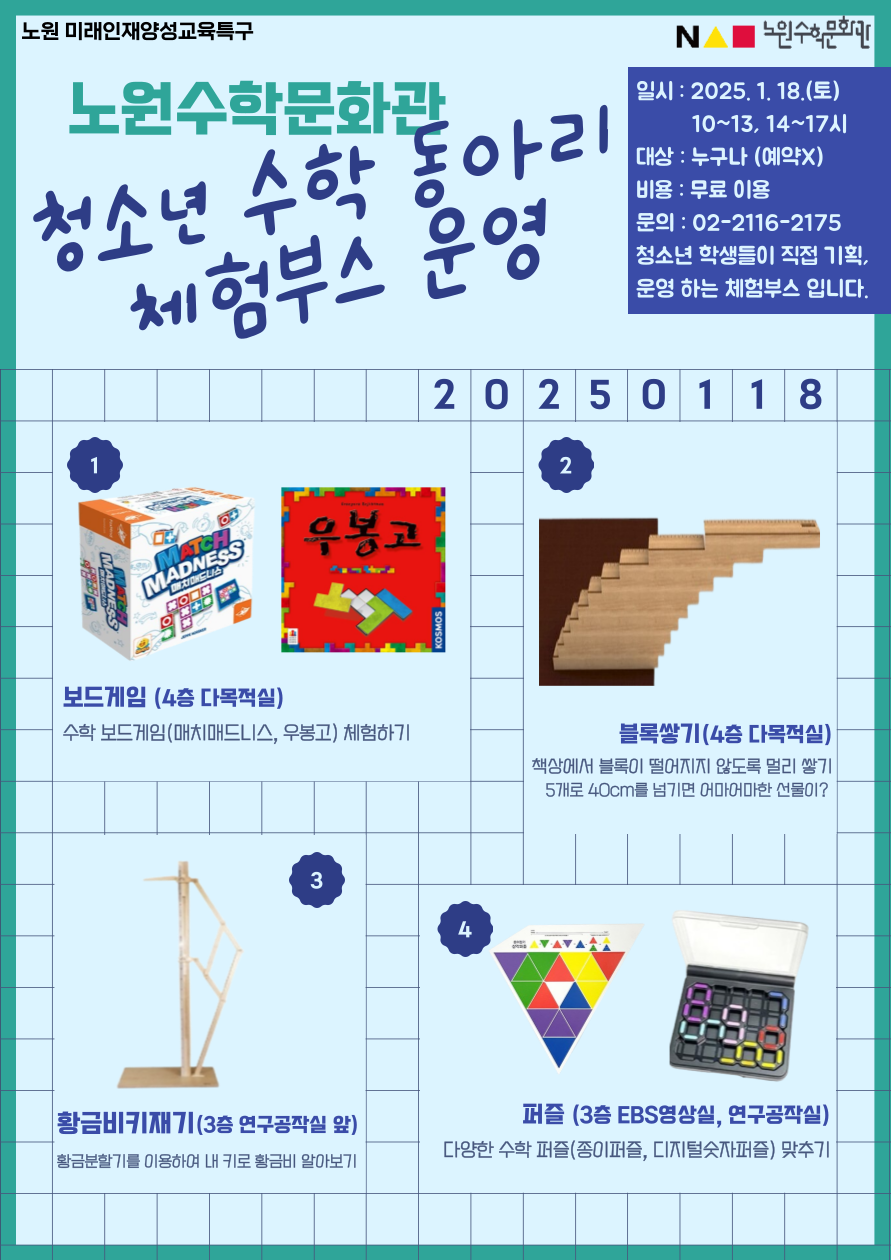 노원수학문화관 청소년수학동아리가 주최하는 1월 체험부스