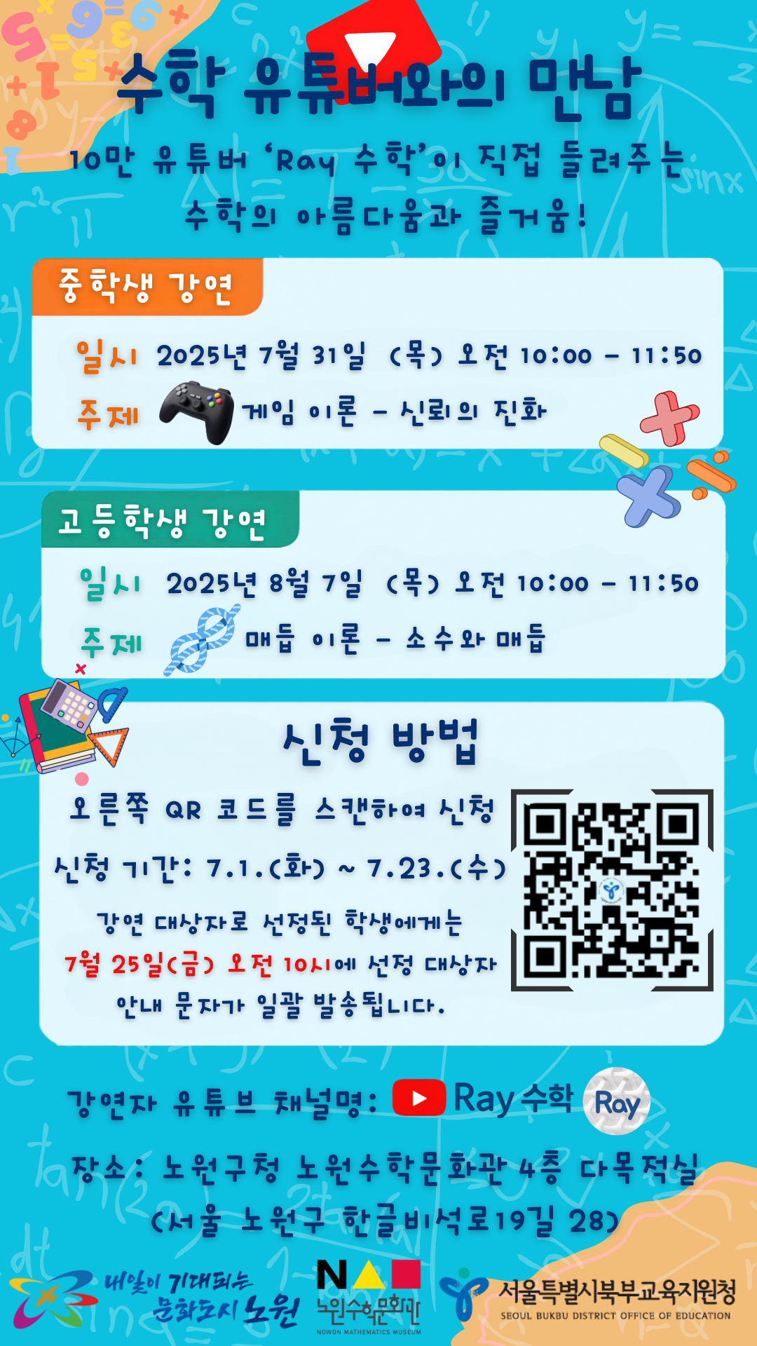 노원수학문화관에서는 중·고등학생을 대상으로 수학의 흥미로운 세계를 소개하는 특별강연을 마련하였습니다.