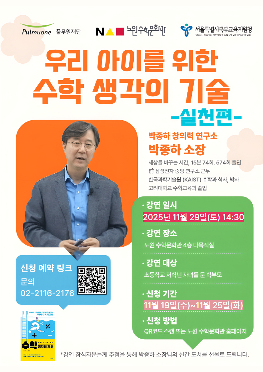 노원수학문화관에서는 지난 9월 6일 진행되었던 박종하 소장님의 '우리 아이를 위한 수학 생각의 기술' 강연이 큰 호응을 얻어,