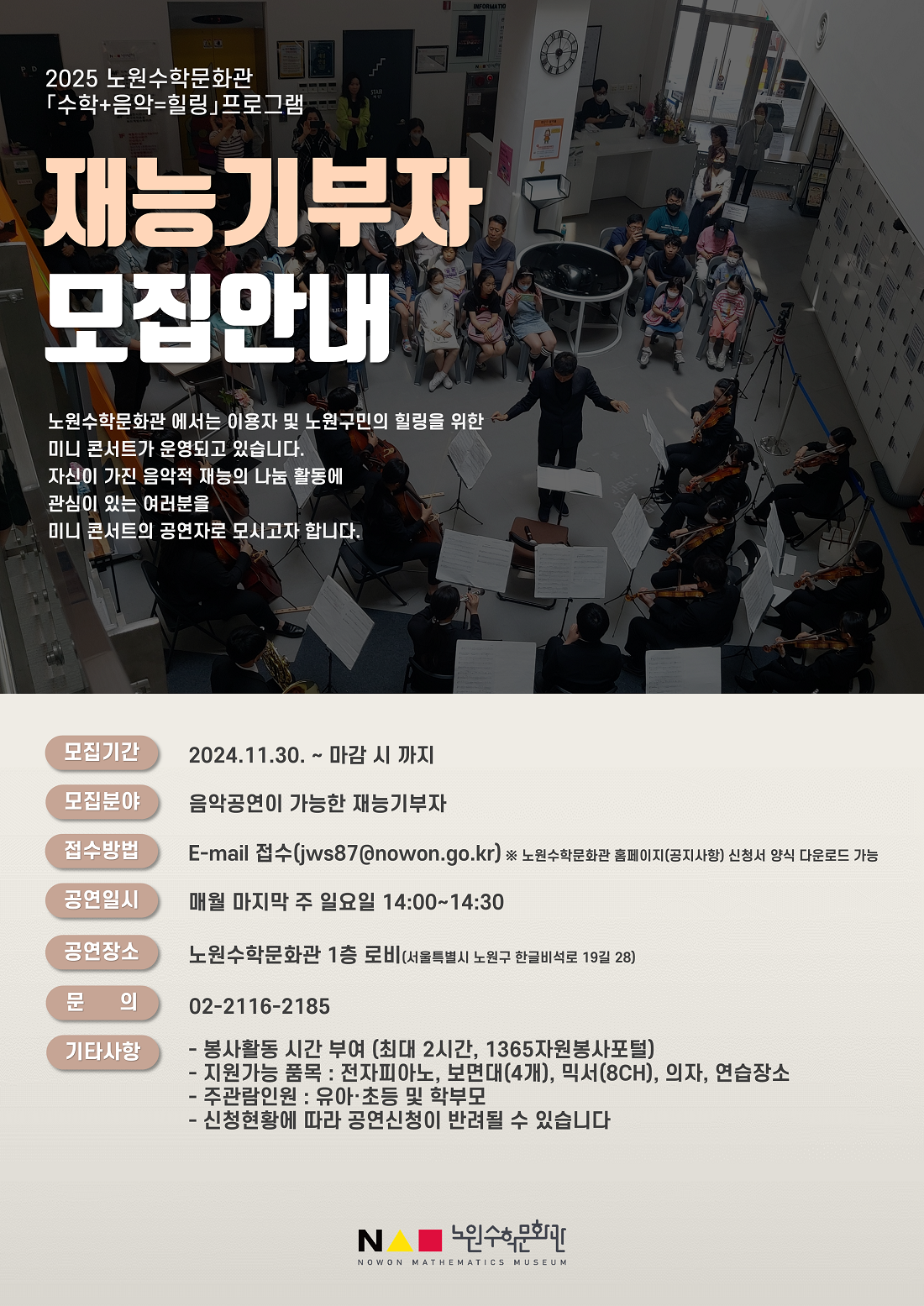 2025년도 노원수학문화관 「수학+음악=힐링」 음악공연 재능기부자를 모집합니다♬