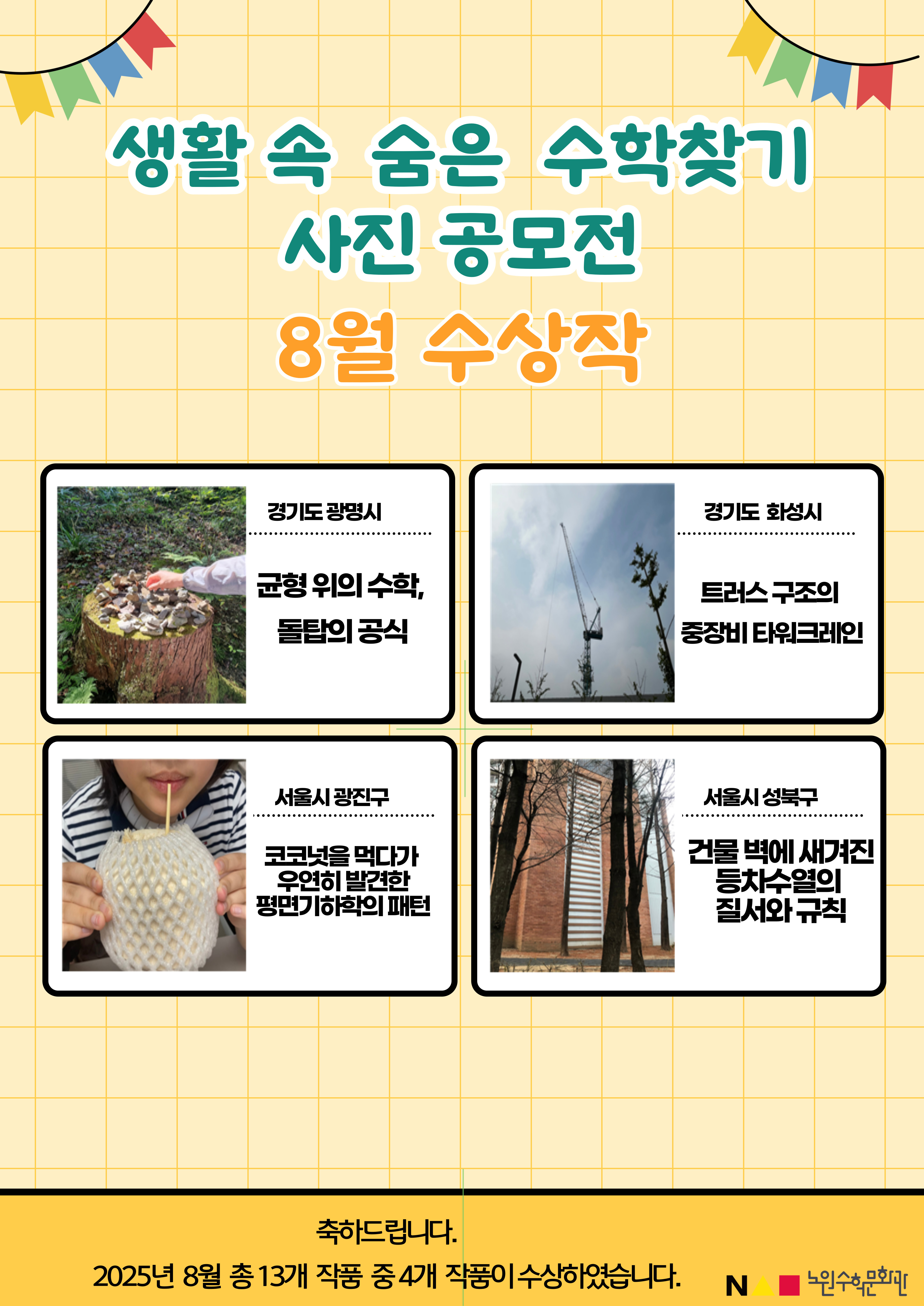 8월 공모전에서는 일상 속의 기하학, 수열, 균형, 구조역학 같은 다양한 수학적 요소를 발견한 작품들이 출품 되었습니다.