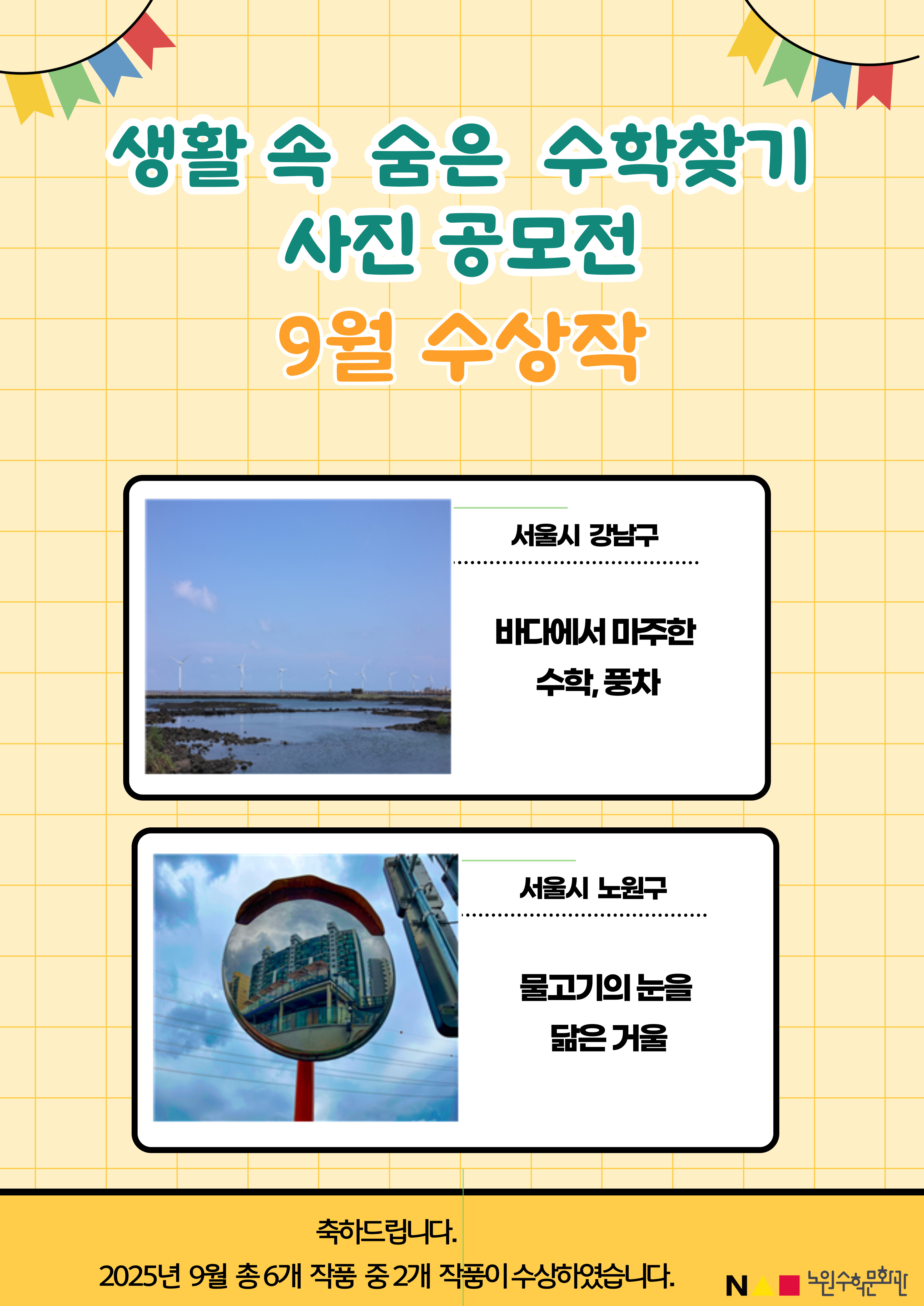 9월 공모전에서는 일상 속의 기하학적 패턴과 자연 속 회전대칭 같은 다양한 수학적 요소를 발견한 작품들이 출품 되었습니다.