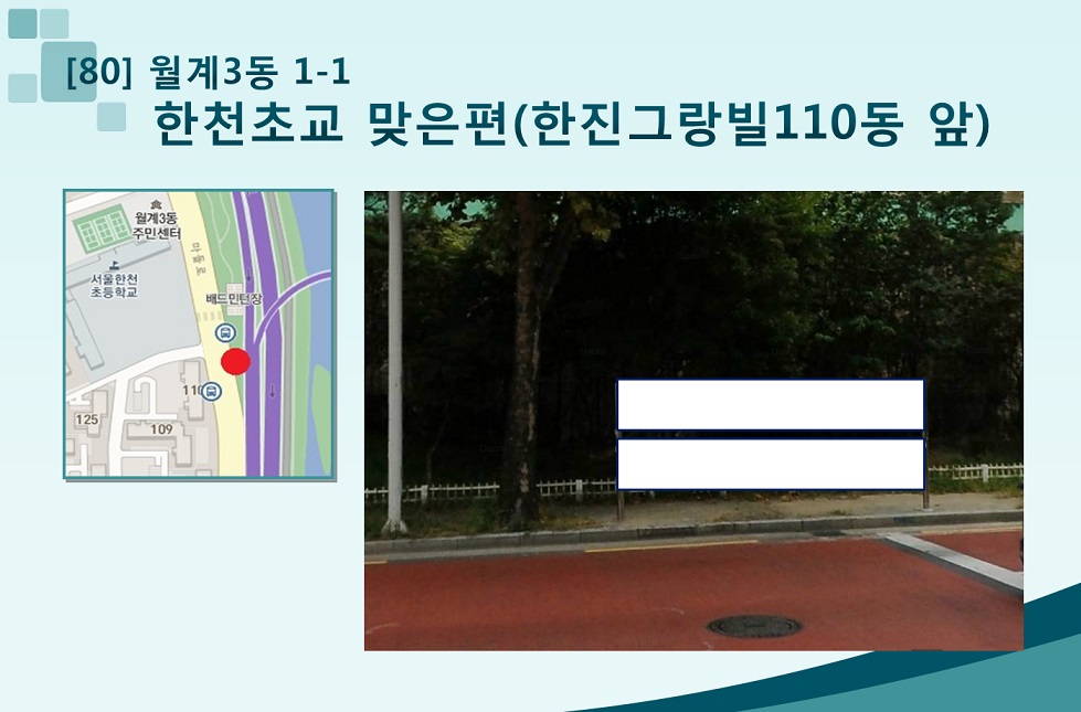 | 월계1동 | 월계-신3-1 | 월계1동 어린이집 건너편 | 지도 | 현장 | 1단6.0x0.7 | 신청가능 | |