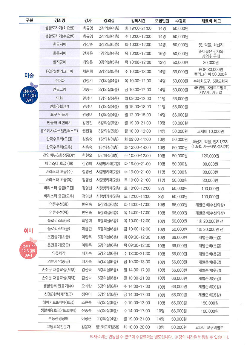 | 50% 감면 대상 | 중증·경증 장애인, 3자녀(다둥이카드 소지하고 만 18세 이하) 이상 가구, 다문화가정, 결혼이민자, 북한이탈주민 ※ 한 가구당 한 강좌에 한함 |