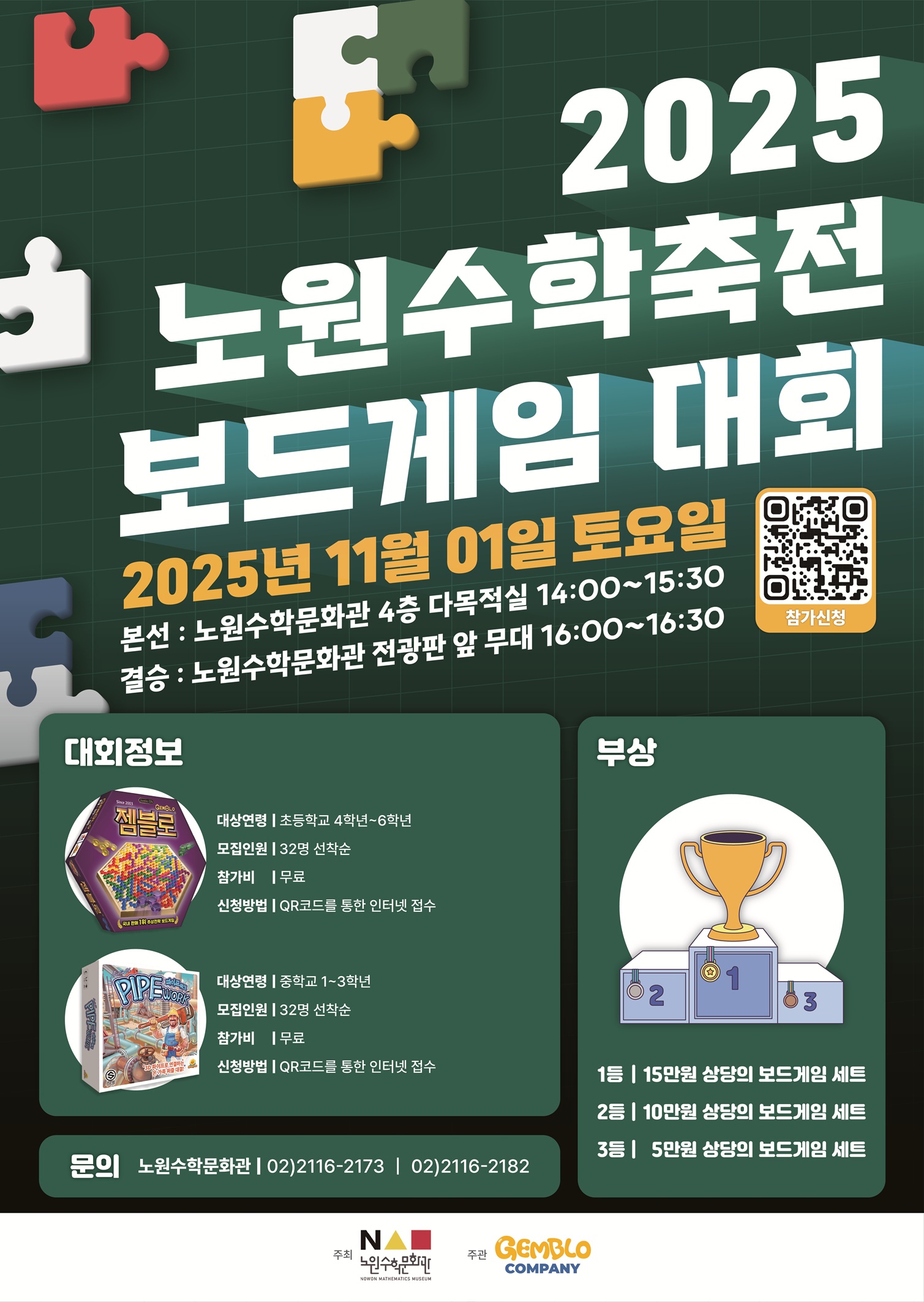 ○ 신청방법 : 네이버폼 제출(* 9월 17일 10시부터 신청) → [바로가기] *선착순 마감 시 아래 대기자 신청 링크를 이용해주세요. ※ 대기자 신청 → [바로가기] *취소자 발생 시 순차적으로 연락드립니다. ○ 부상 : 1등 15만원 상당의 보드게임 / 2등 10만원 상당의 보드게임 / 3등 5만원 상당의 보드게임