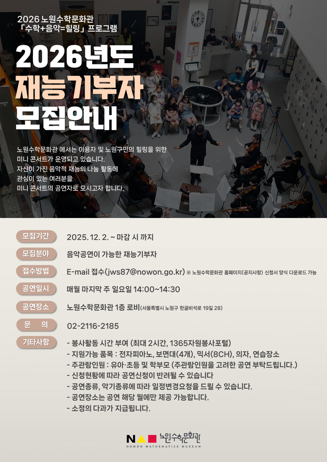 [마감]2026년 노원수학문화관『수학+음악=힐링』 프로그램 음악공연 재능기부자 모집 안내[마감]
