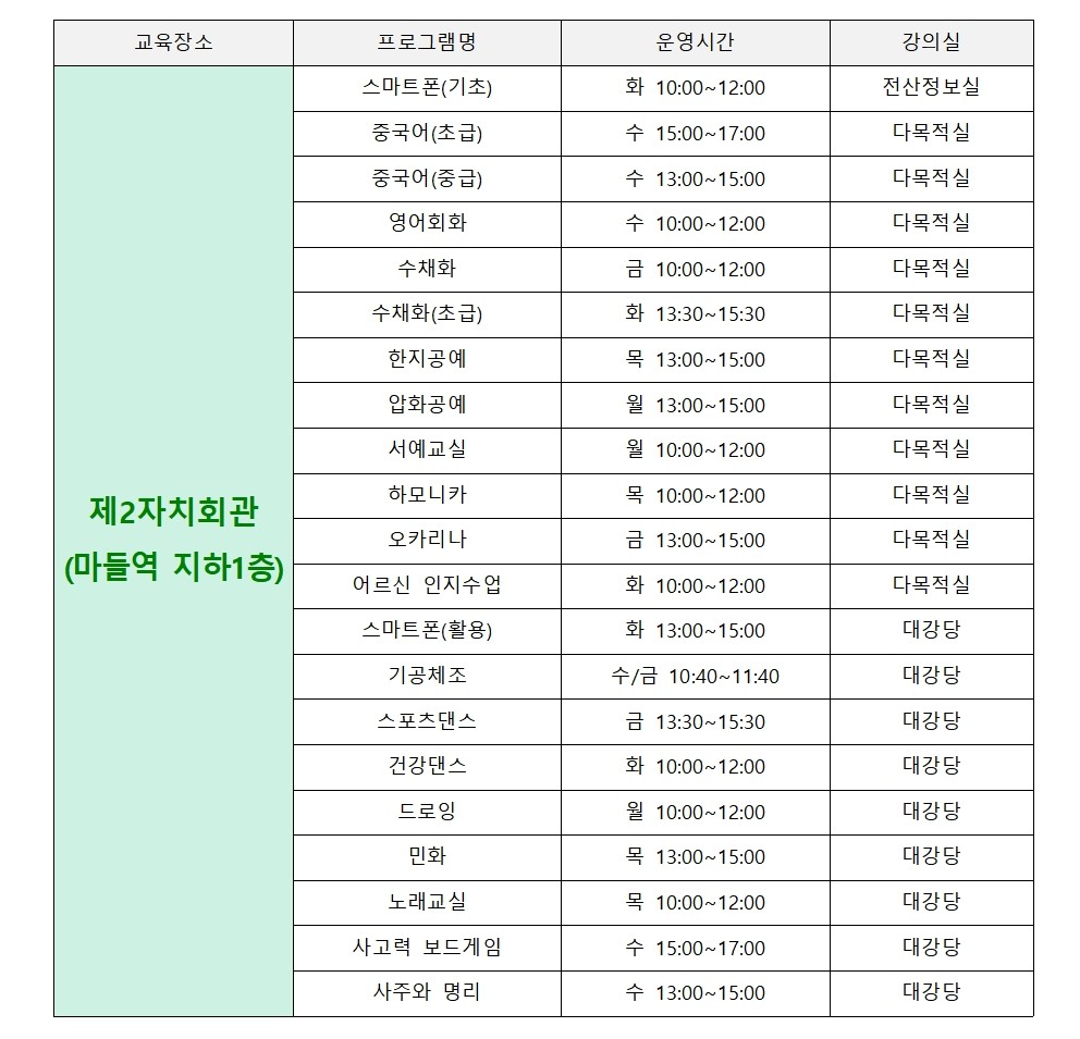 제2자치회관(마들역 지하1층)에서는 21개 프로그램이 진행됩니다.