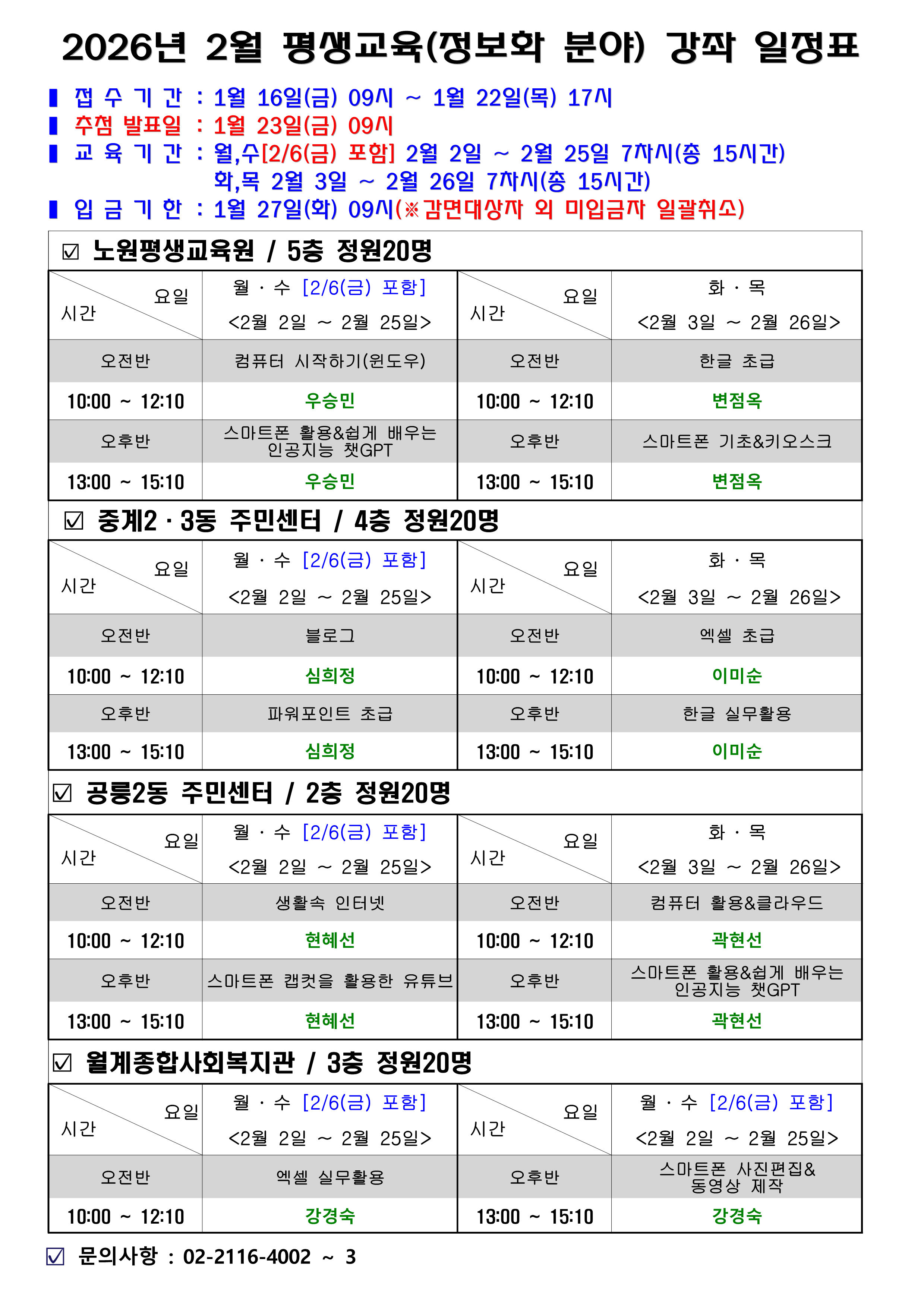 2026년 2월 평생교육(정보화 분야) 강좌 일정표