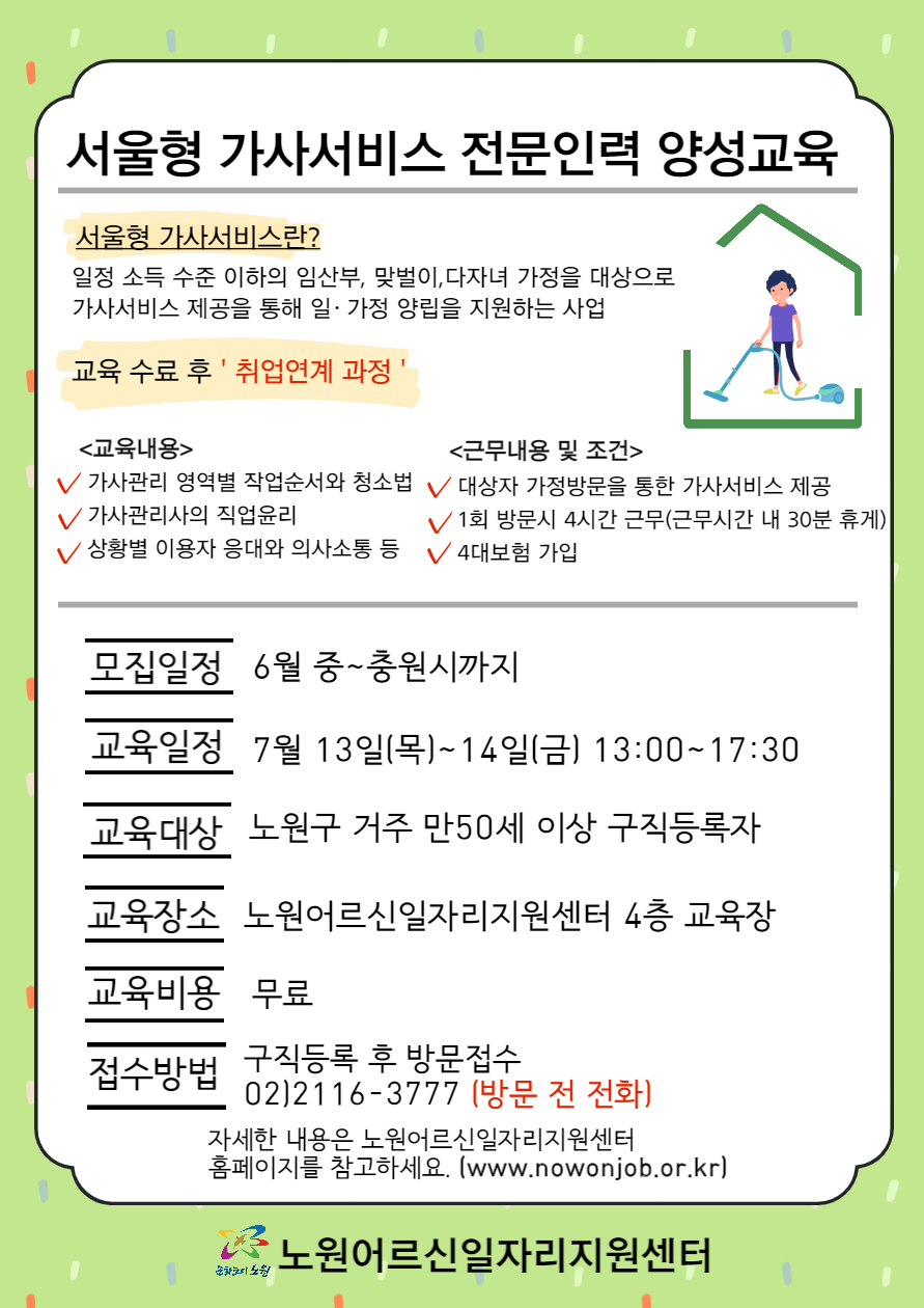 [전체공지] 서울형 가사서비스 전문인력 양성 과정 교육생 모집 [노원어르신일자리지원센터]