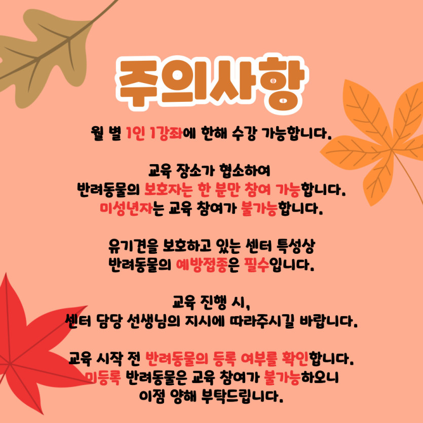 ※ 댕댕하우스 홈페이지 회원가입 후 신청 가능, 월별 1인 1강좌 수강 가능합니다.