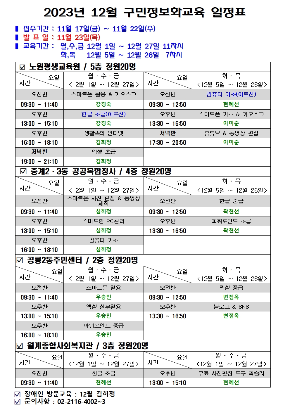12월 구민정보화교육(토요특강) 수강생 모집 일정 안내