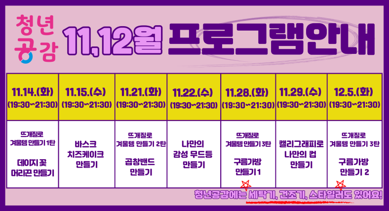 또한 청년들이 자유롭게 사용할 수 있는 세탁기/건조기/스타일러도 많은 관심 부탁드립니다!