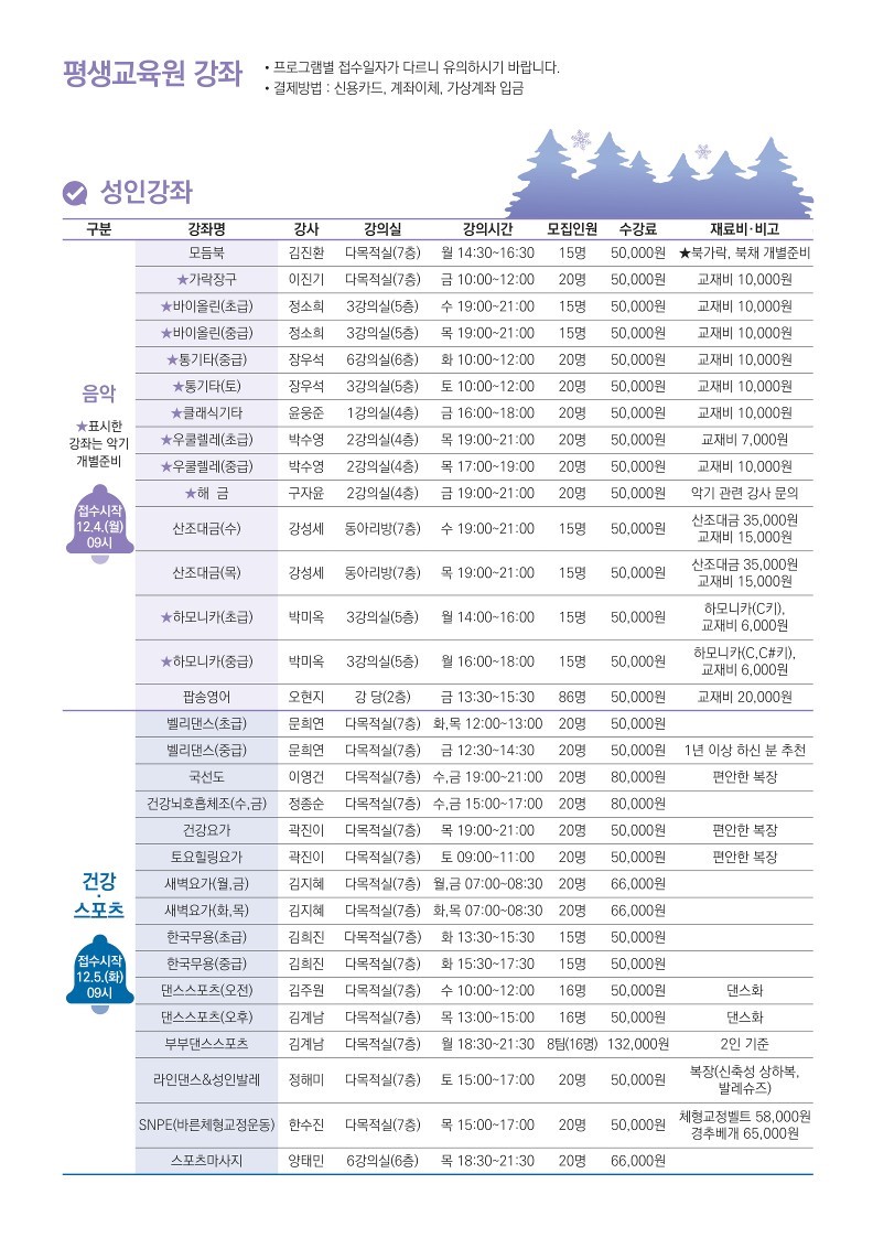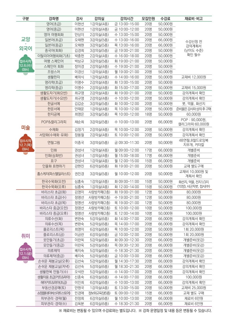 2024년 1분기 자치회관 프로그램 접수일정 안내