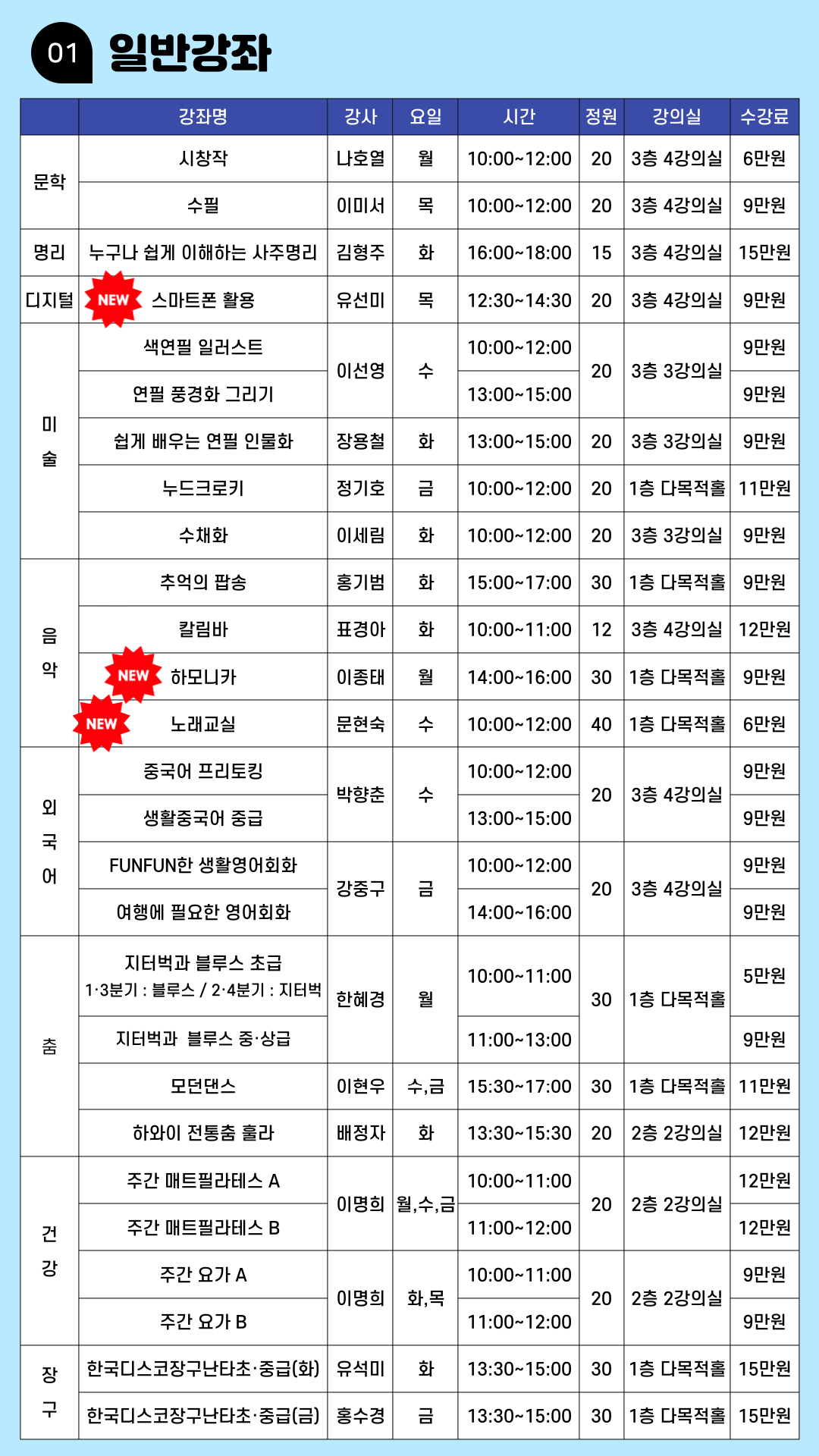 ※ 정원 50% 미달 시 해당 강좌가 폐강될 수 있습니다.