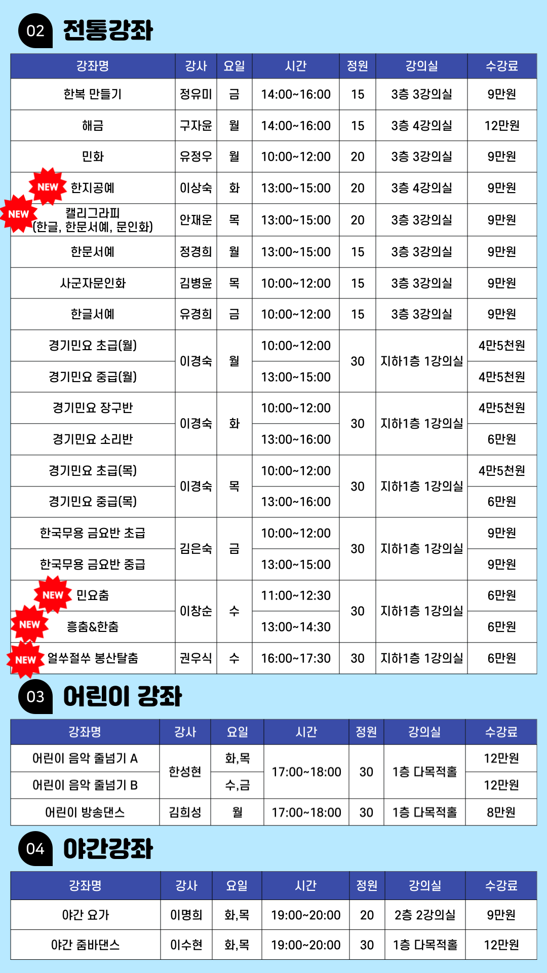 ※ 노래교실, 얼쑤절쑤 봉산탈춤, 민요춤, 흥춤&한춤, 해금, 한지공예 등 약 50여 개의 강좌가 개설되었습니다.