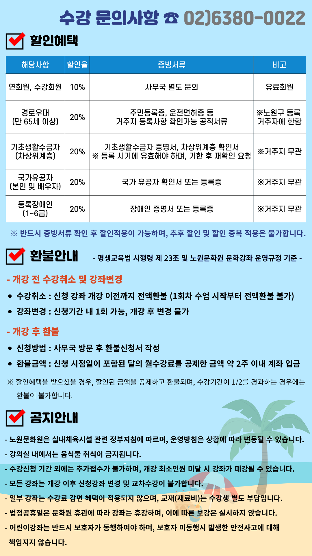 ※ 홈페이지 강좌 신청 시 할인혜택 적용을 희망하시는 경우 반드시 노원문화원 사무국으로 우선 연락 주시기 바랍니다.