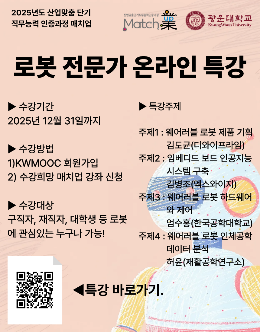 공지[노원구] [광운대학교] 2025 매치업 로봇 분야 전문가 온라인 특강 안내(무료 교육)