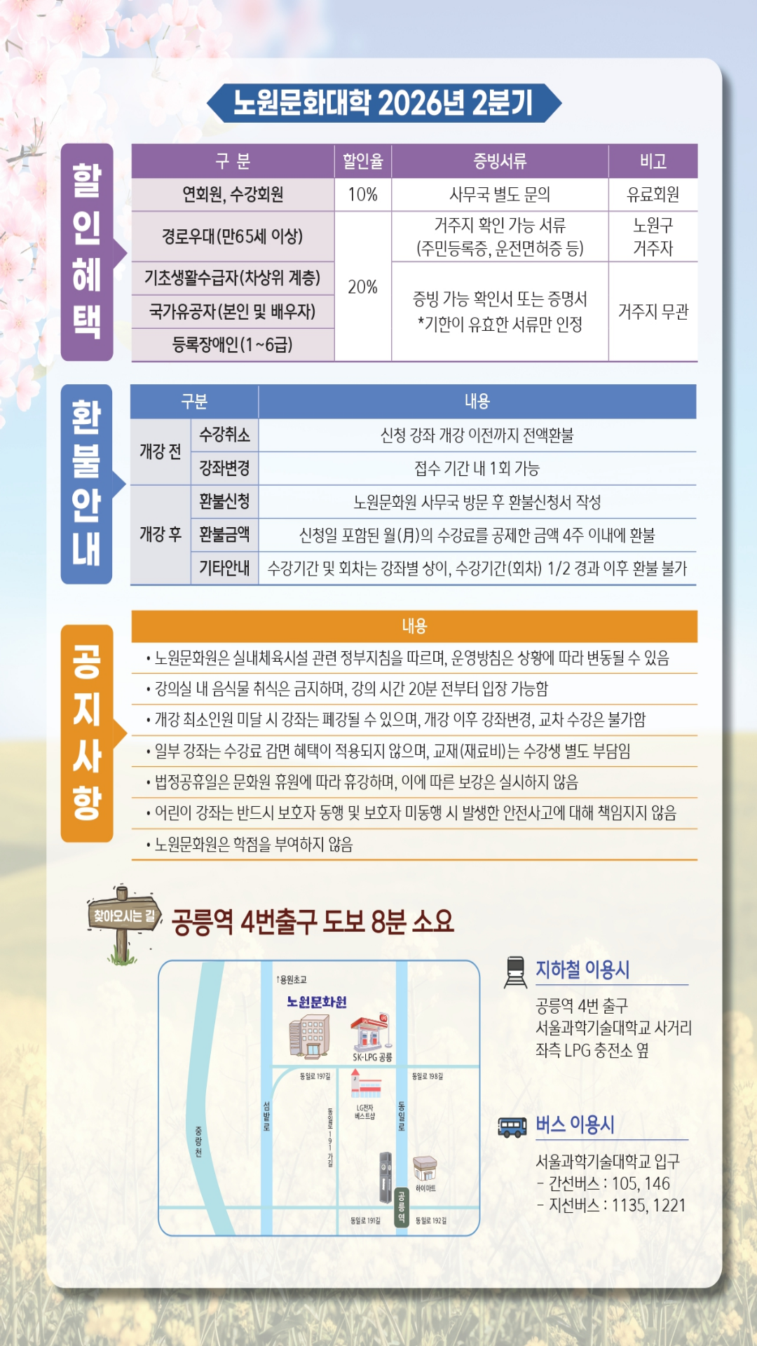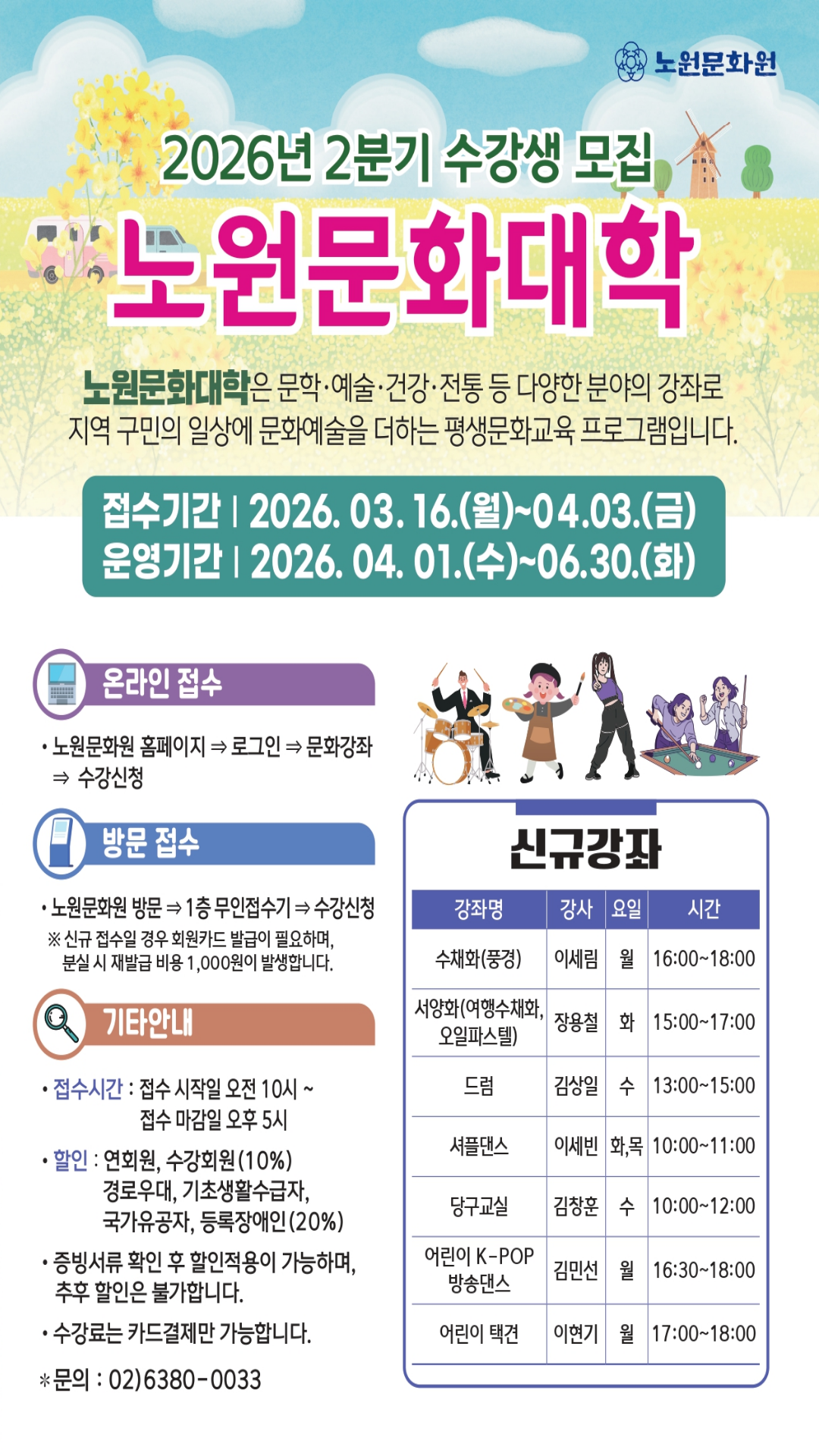 공지[노원구] [노원문화원] 2026년 2분기(4~6월) <노원문화원 문화대학> 접수안내