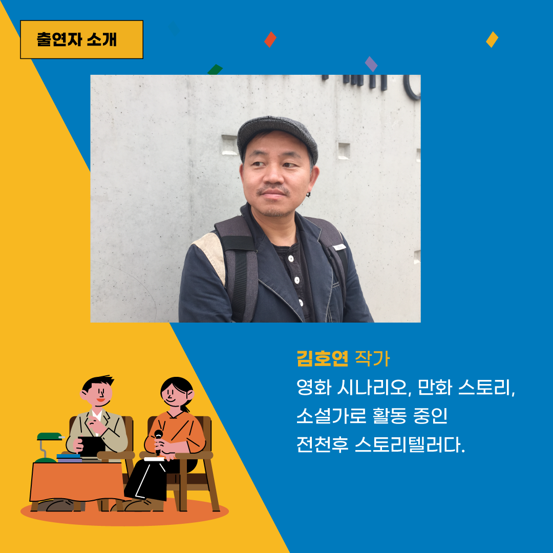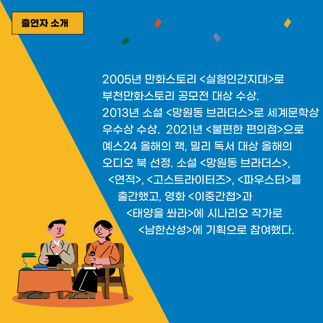 영화 시나리오, 만화 스토리, 소설가로 활동 중인 전천후 스토리텔러. 2005년 만화스토리 <실험인간지대>로 부천만화스토리 공모전 대상 수상. 2013년 소설 <망원동 브라더스>로 세계문학상 우수상 수상. 2021년 <불편한 편의점>으로 예스24 올해의 책, 밀리 독서 대상 올해의 오디오 북 선정. 소설 <망원동 브라더스>, <연적>, <고스트라이터즈>, <파우스터>를 출간했고, 영화 <이중간첩>과 <태양을 쏴라>에 시나리오 작가로 <남한산성>에 기획으로 참여했다.