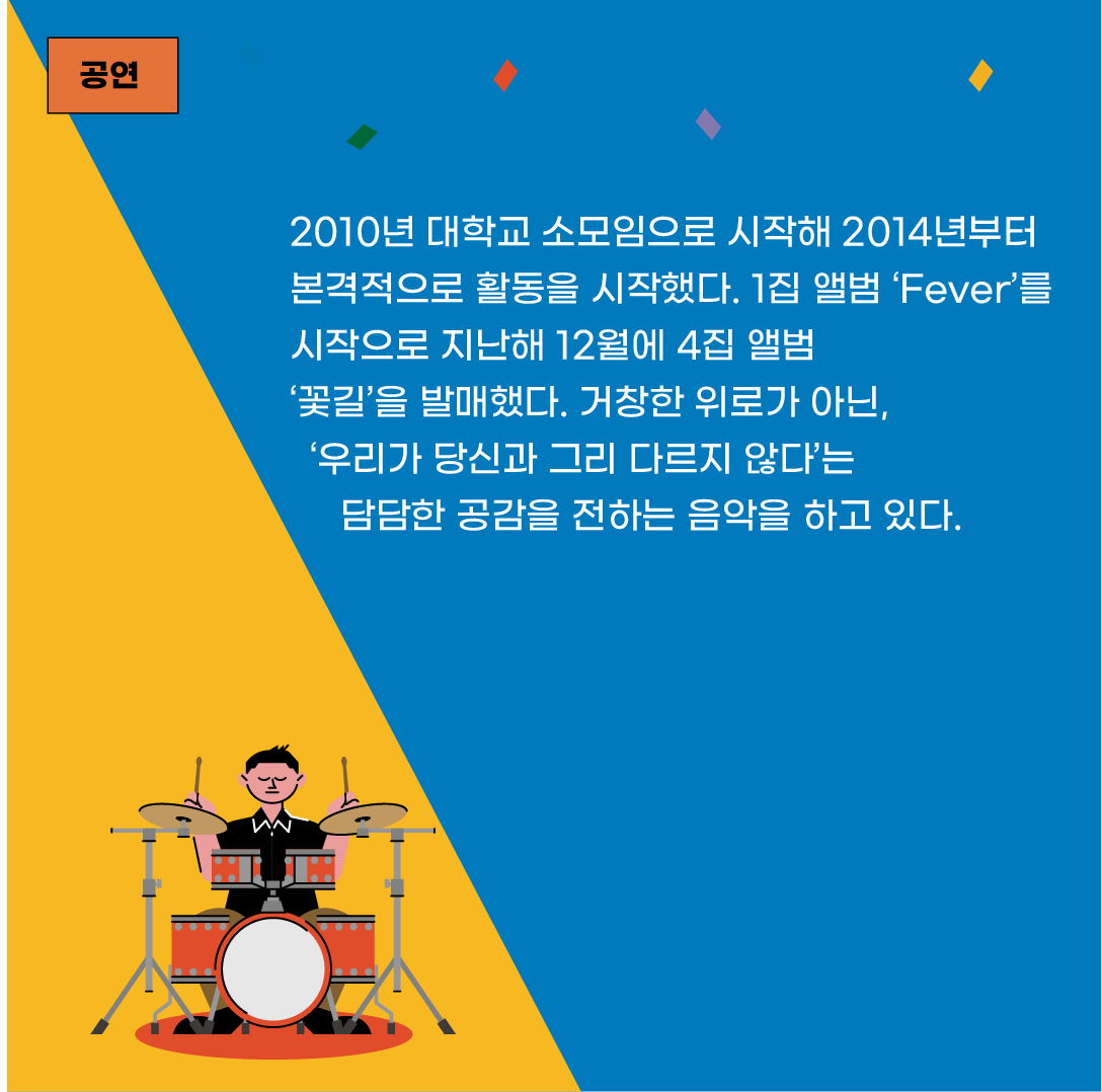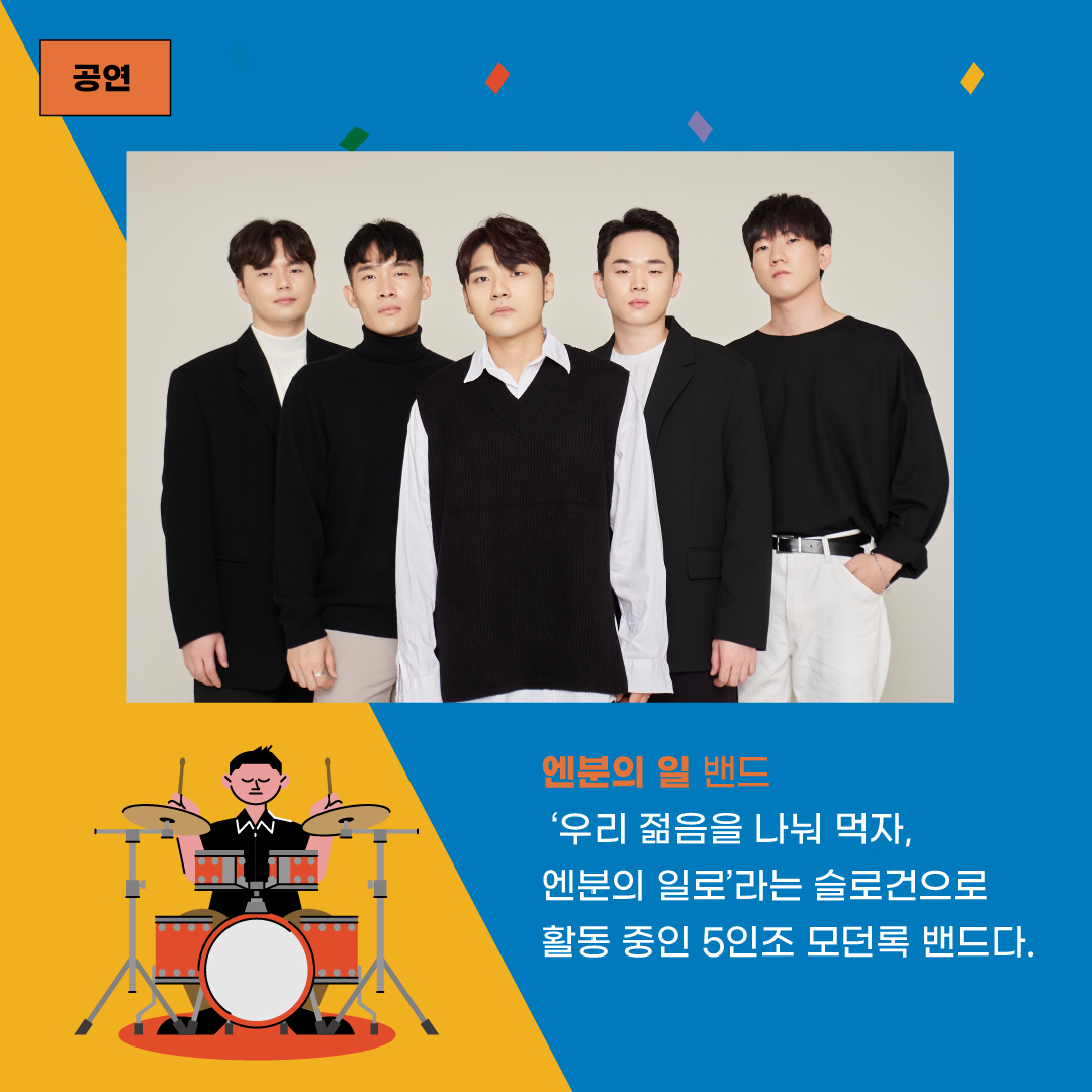 ‘우리 젊음을 나눠 먹자, 엔분의일로’라는 슬로건으로 활동 중인 5인조 모던록 밴드다. 2010년 대학교 소모임으로 시작해 2014년부터 본격적으로 활동을 시작했다. 1집 앨범 ‘Fever’를 시작으로 지난해 12월에 4집 앨범 ‘꽃길’을 발매했다. 거창한 위로가 아닌, ‘우리가 당신과 그리 다르지 않다’는 담담한 공감을 전하는 음악을 하고 있다.