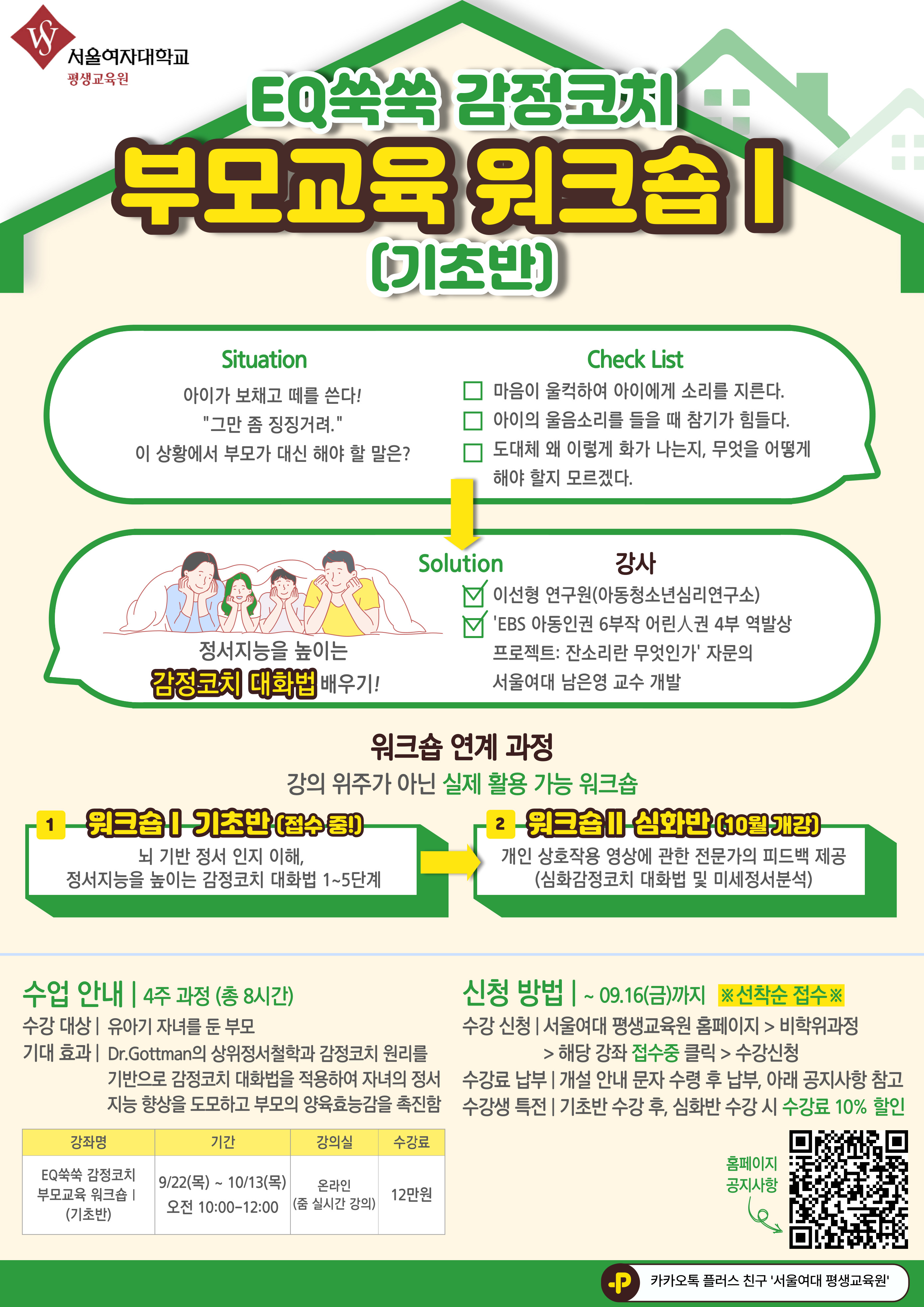 [공릉동] 서울여자대학교 부설 평생교육원 - EQ쑥쑥 감정코치 부모교육 워크숍Ⅰ(기초반) 접수 안내