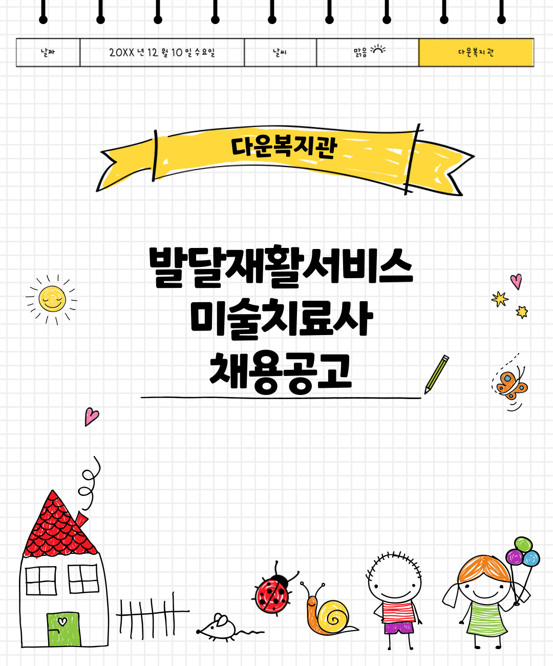 다운복지관 사회서비스팀에서는 장애아동 대상으로 미술치료 서비스를 제공할 역량 있는 직원을 아래와 같이 모집합니다. 많은 관심과 지원 부탁드립니다.