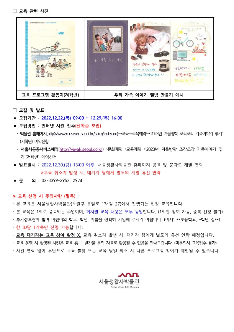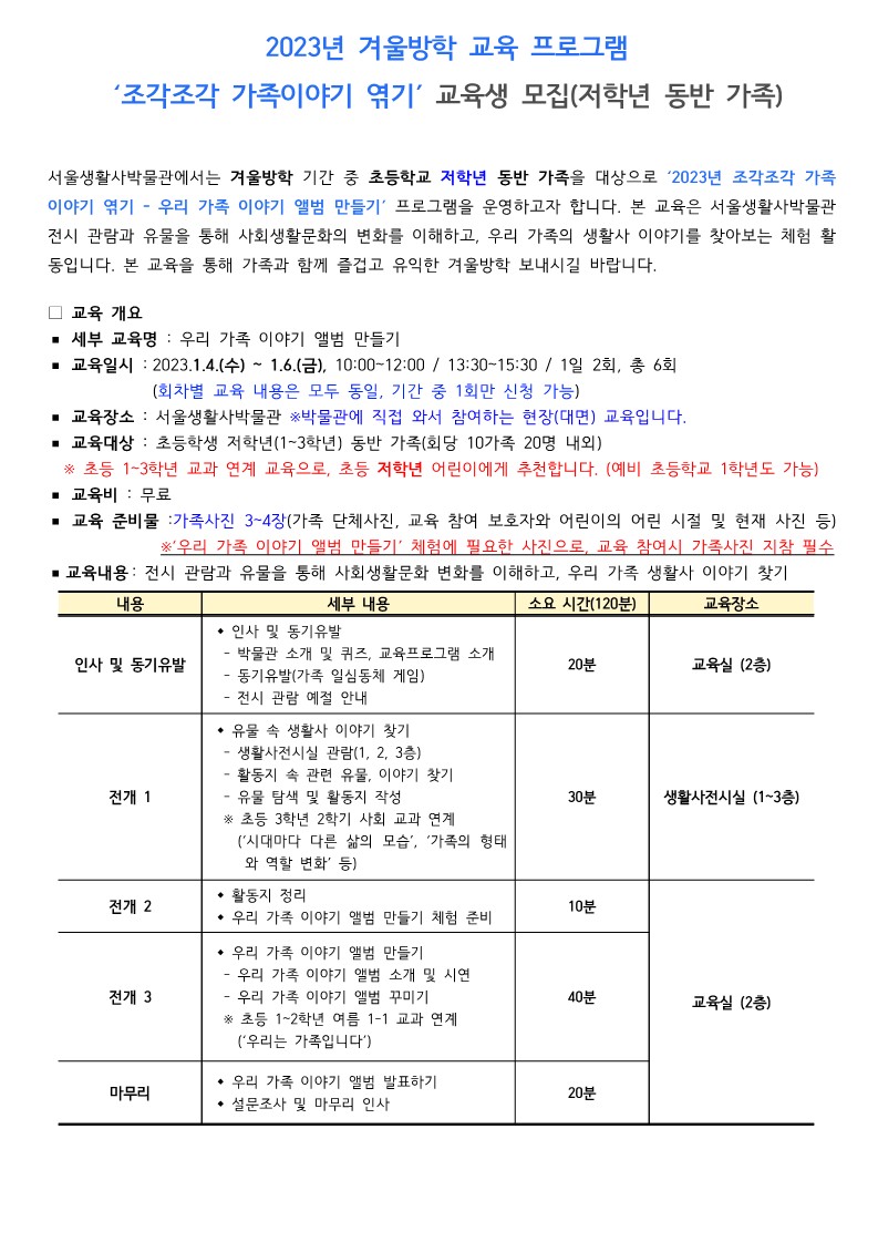 서울생활사박물관 - 겨울방학 교육 프로그램(저학년)