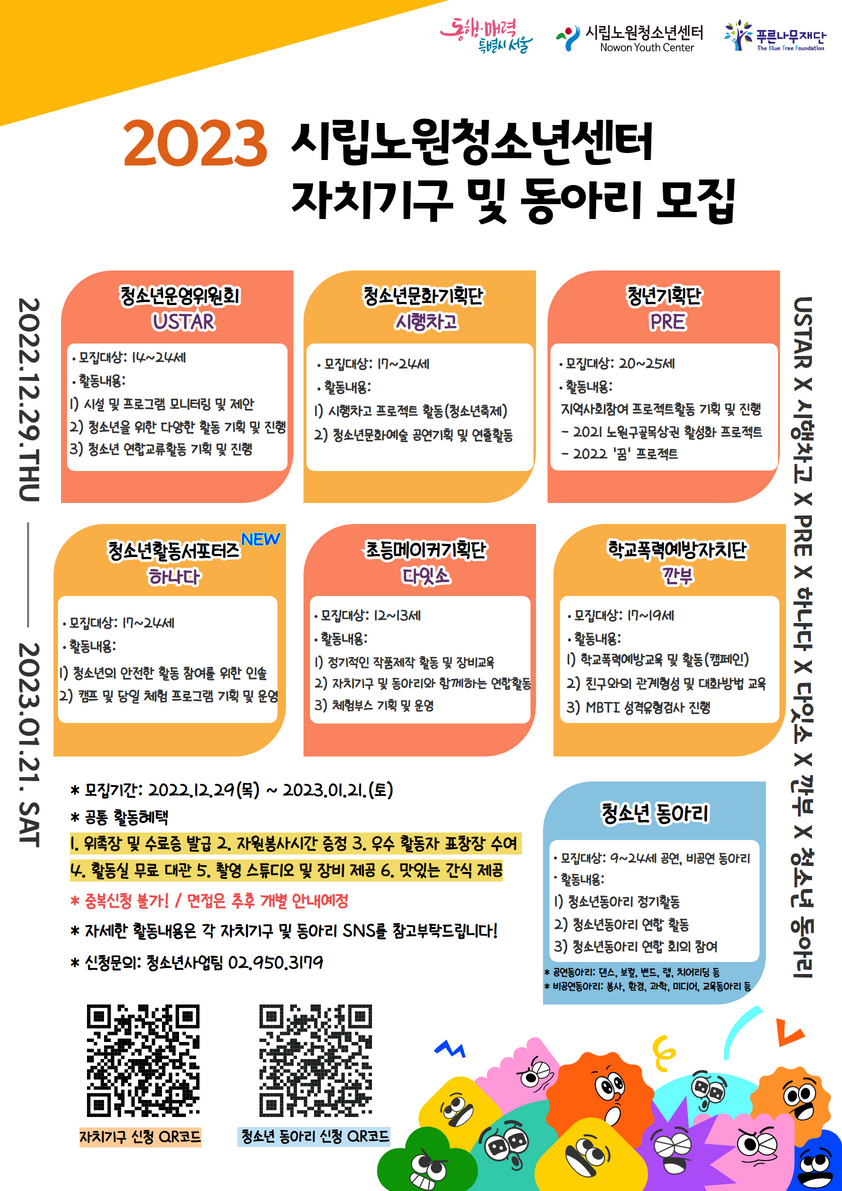 2023년 시립노원청소년센터 자치기구 및 동아리 참가 청소년 모집