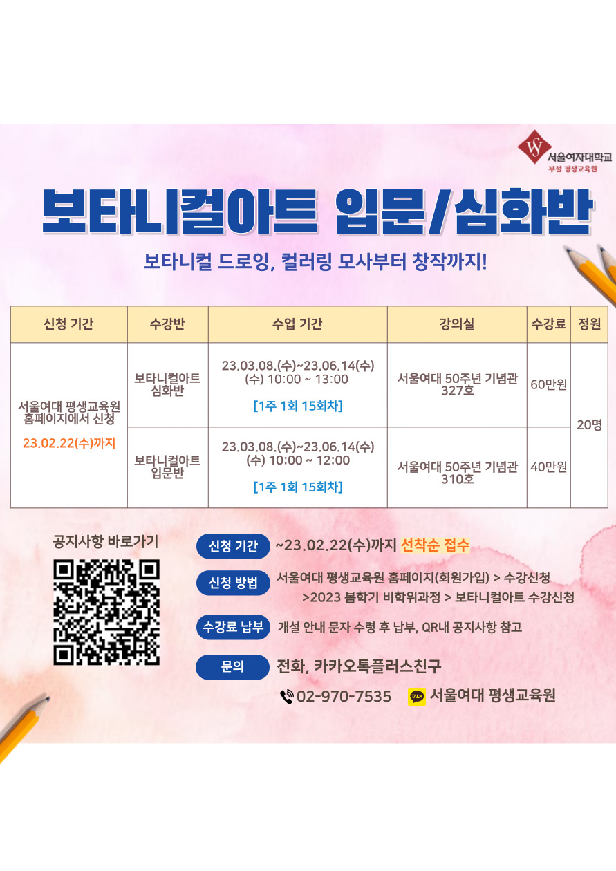 2023학년도 봄학기 평생교육원 비학위과정- 보타니컬아트 입문/심화반