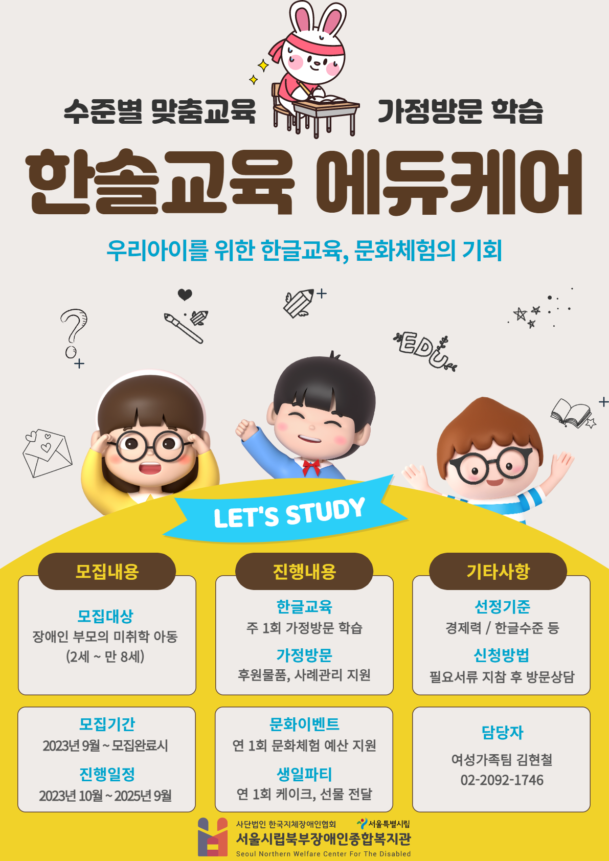 [상계동] [서울시립북부장애인종합복지관] "한솔교육 에듀케어(한글교육)" 신규가정 모집