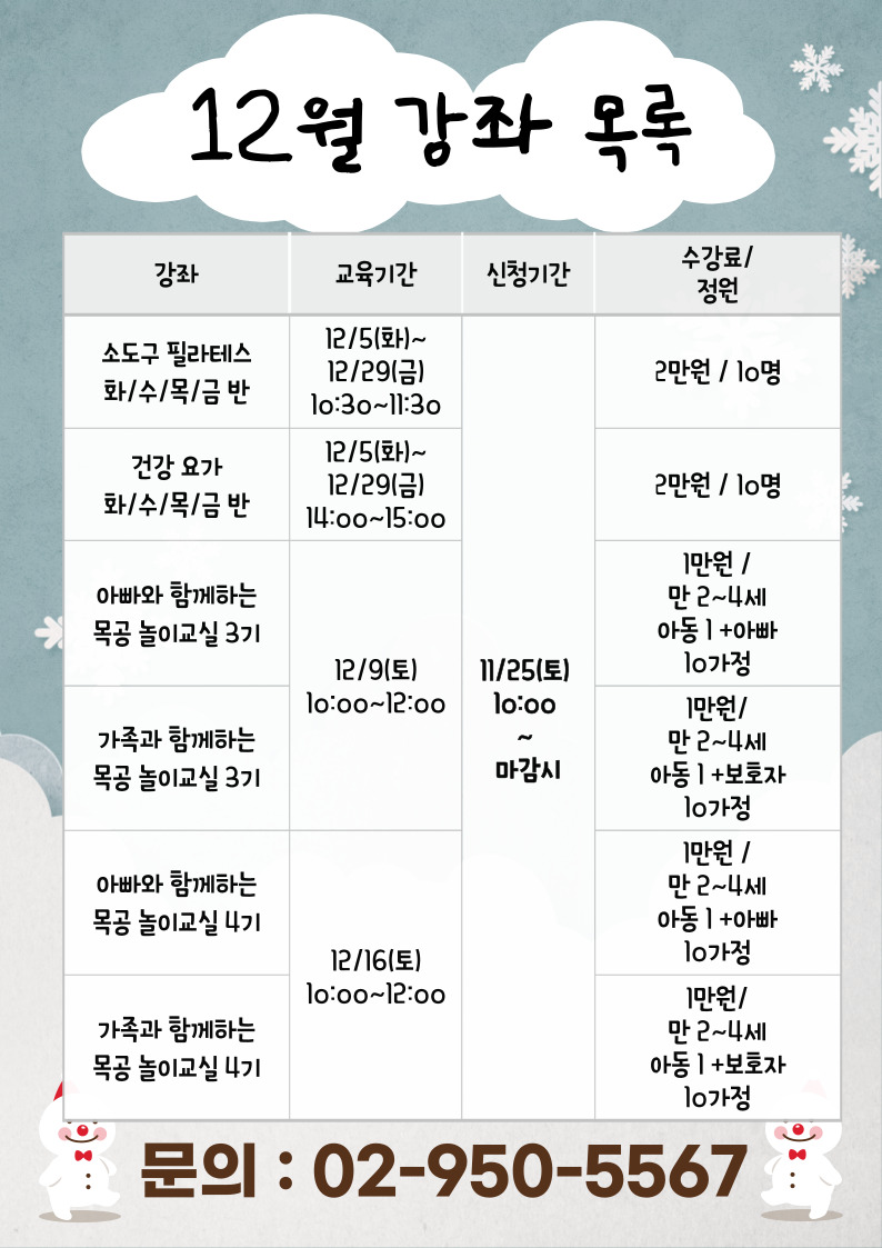 2) 수요반 : 12/6, 12/13, 12/20, 12/27 10:30~11:30 (매주 수요일 / 총 4회)