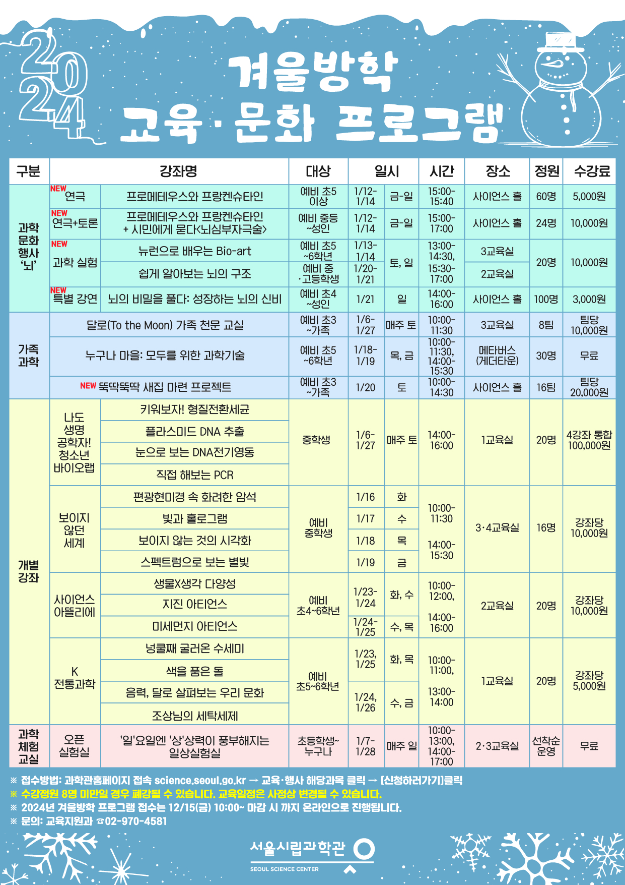 [중계동] 서울시립과학관 - 2024 겨울방학 교육, 문화 프로그램 안내