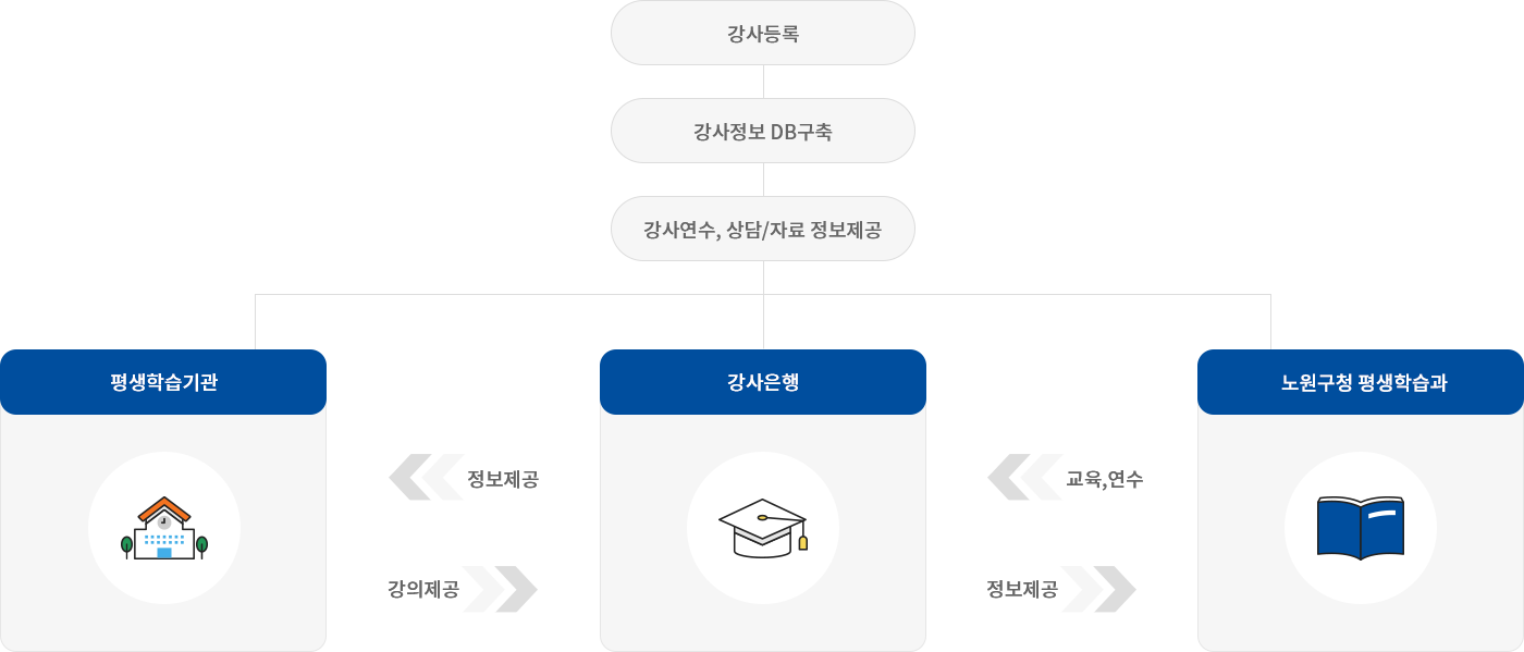 강사은행은 지역 내에서 활동하는 강사가 직접 등록한 정보를 체계적인 DB 시스템을 통해 평생교육기관에 강사 및 강좌정보를 제공합니다. 유능한 강사와 평생교육기관과의 효율적인 연계를 이루어 등록된 강사에게 폭넓은 강의 활동 기회를 제공하고자 합니다. 궁극적으로 강사은행은 평생교육 활성화를 위한 사업입니다.