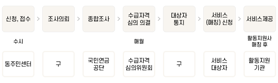- 지원금액(내용) : 1~15구간으로 분류하여 월 60~480시간 범위 내 활동보조, 방문목욕 등의 서비스 제공