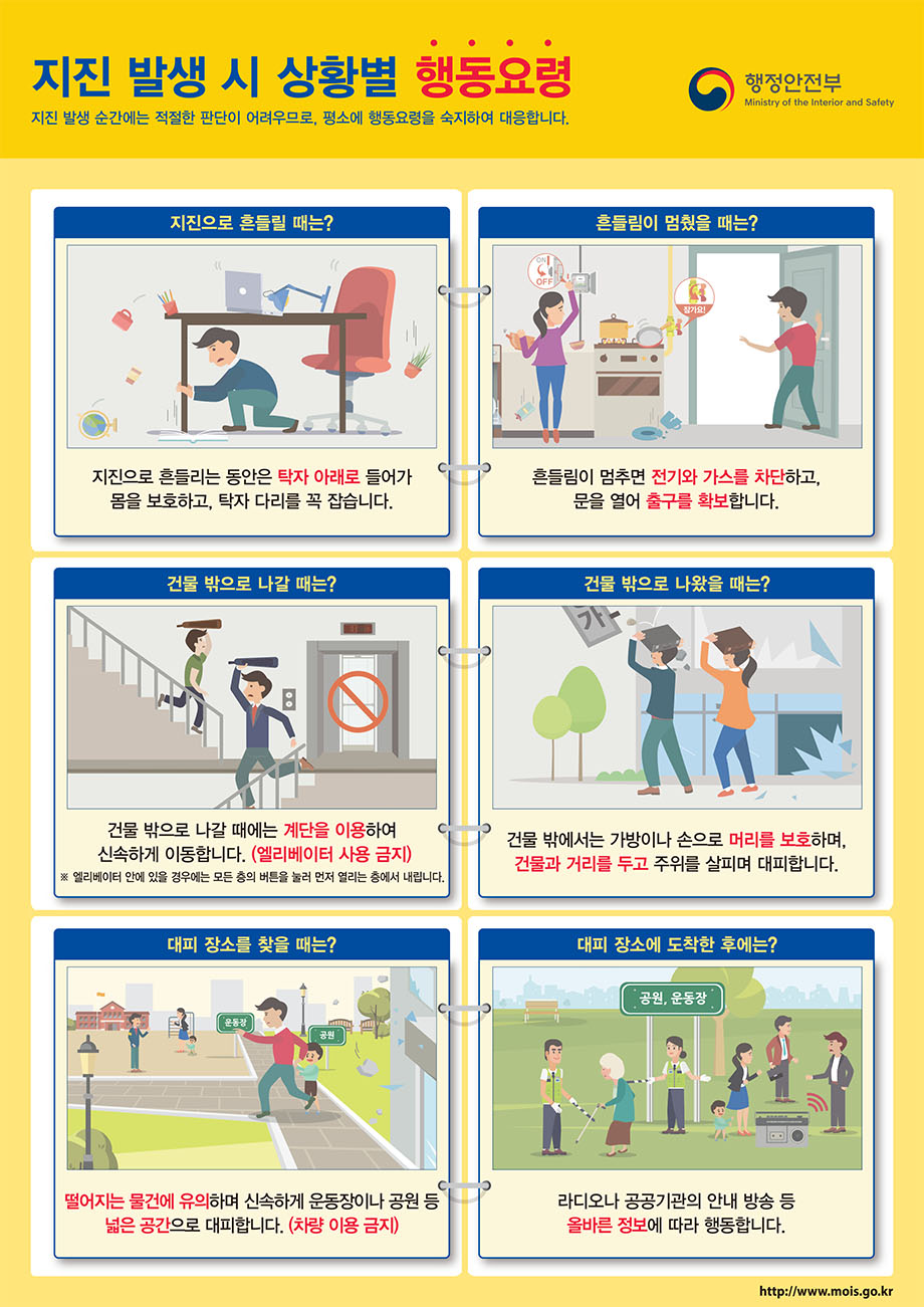 - 탁자 아래와 같이 집 안에서 대피할 수 있는 안전한 대피 공간을 미리 파악해 둡니다.